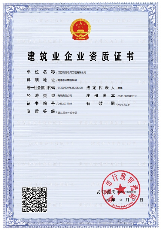 在創業之初,公司就堅持高起點的戰略思路,廣納賢才,集聚行業精英,創新發展,做優企業品牌?,F已取得:承裝二級、承修二級、承試二級,電力工程施工總承包二級,輸變電工程專業承包二級,建筑工程施工總承包二級,建筑機電安裝專業承包二級,地基基礎專業承包二級資質證書,并通過了質量、環境、職業健康和安全管理體系認證,確保各項工作有序管控。